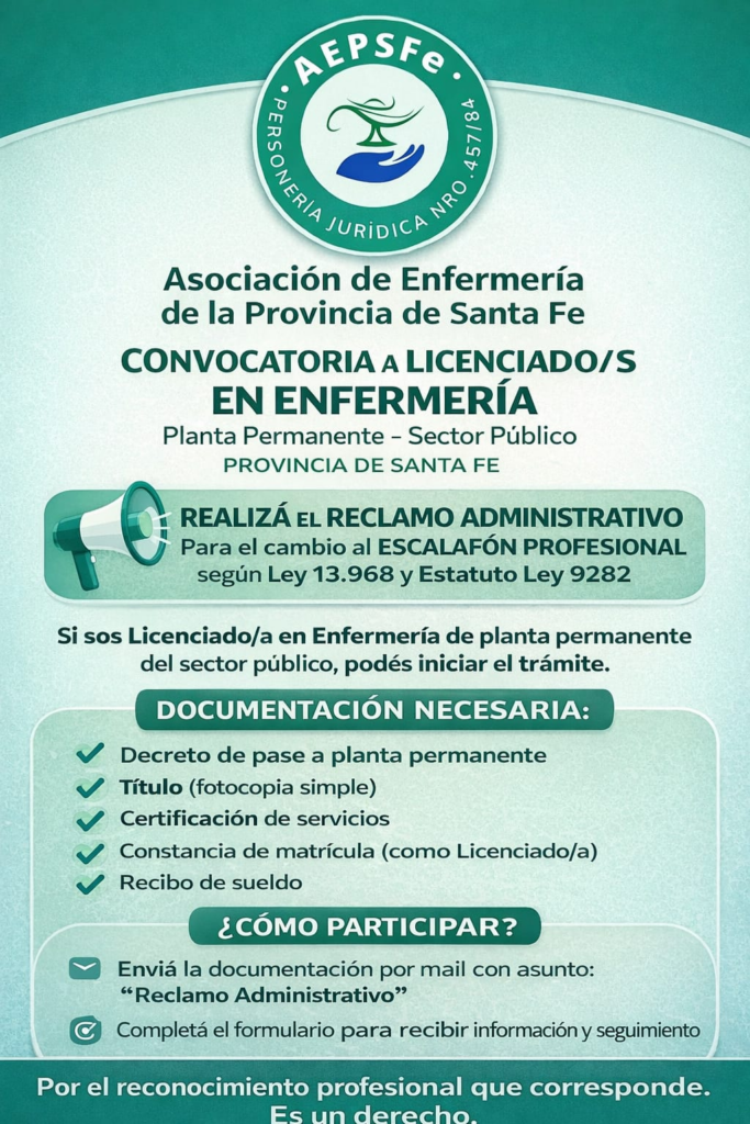 Convocamos a licenciados y licenciadas en enfermería que se desempeñan en la planta permanente del Ministerio de Salud de la Provincia de Santa Fe a informarse y participar de esta instancia clave para el reconocimiento profesional.