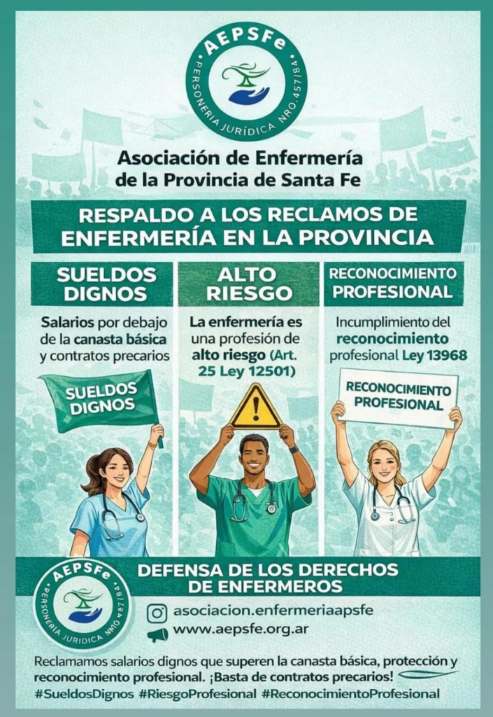 La protesta de enfermeros y enfermeras autoconvocados en la provincia de Santa Fe cumple 18 días de movilización y visibilización, con manifestaciones que se replican en diferentes puntos del territorio provincial. El reclamo, impulsado por espacios independientes como “Enfermería en Marcha” y “Enfermeros en Marcha y en Lucha”, tiene como ejes centrales salarios dignos, mejores condiciones laborales, el pase a planta permanente y el reconocimiento profesional del sector.